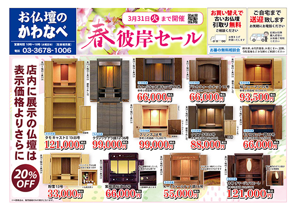 かわなべでは、2026年3月7日(土)から3月31日(火)まで、春彼岸セールを開催いたします。