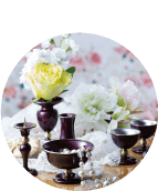お仏壇は、様々な仏具によってお飾り致します。主な仏具は、「香炉」、「燭台」、「花立て」などをまとめたセット式仏具と「リン」が一般的です。 |